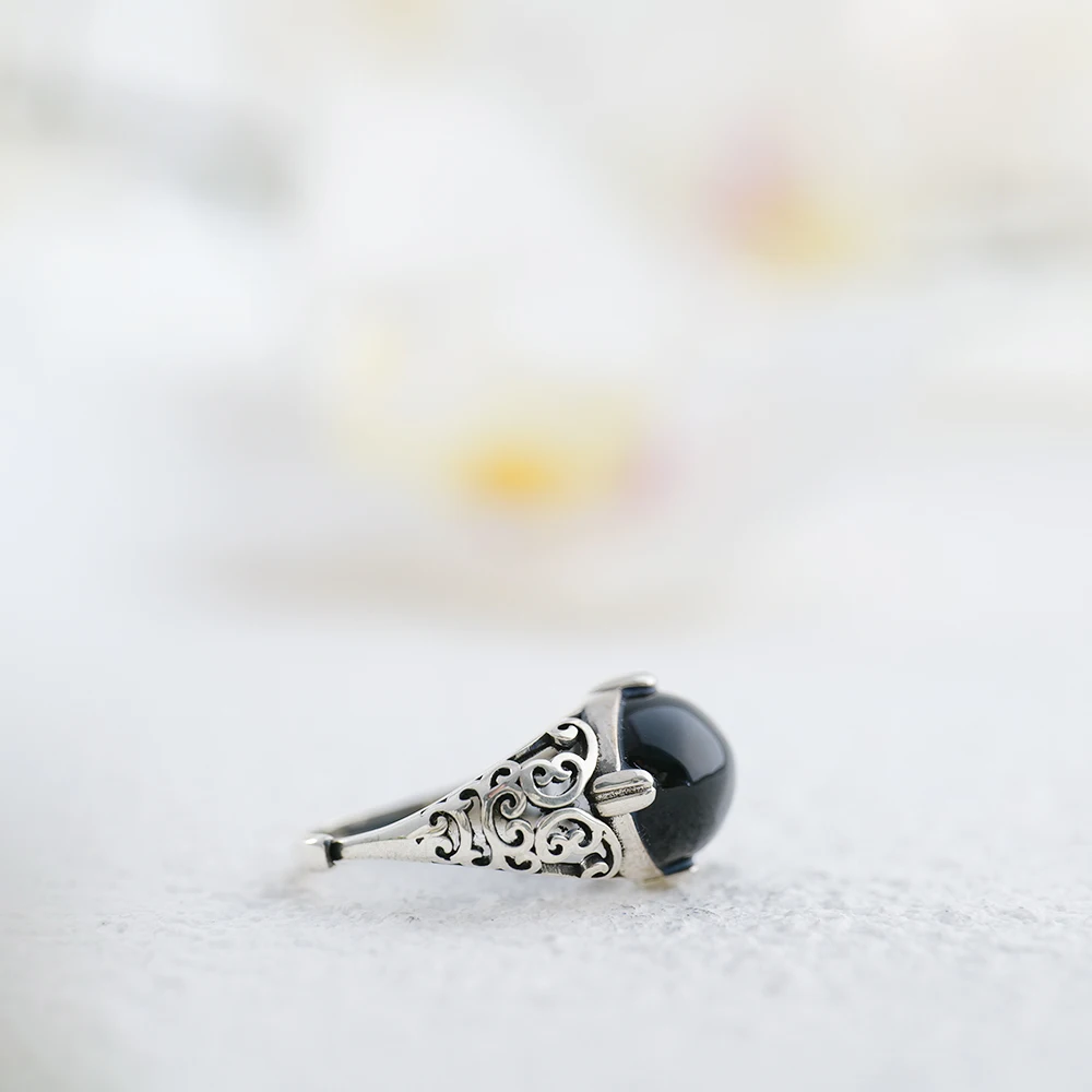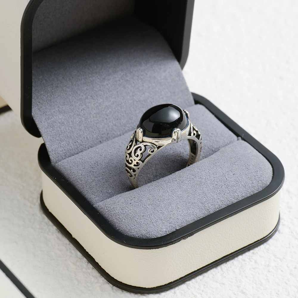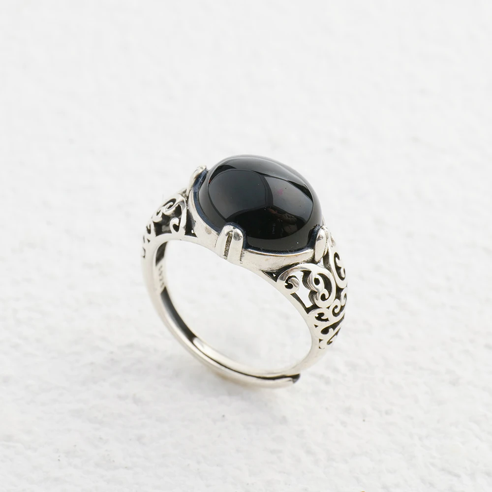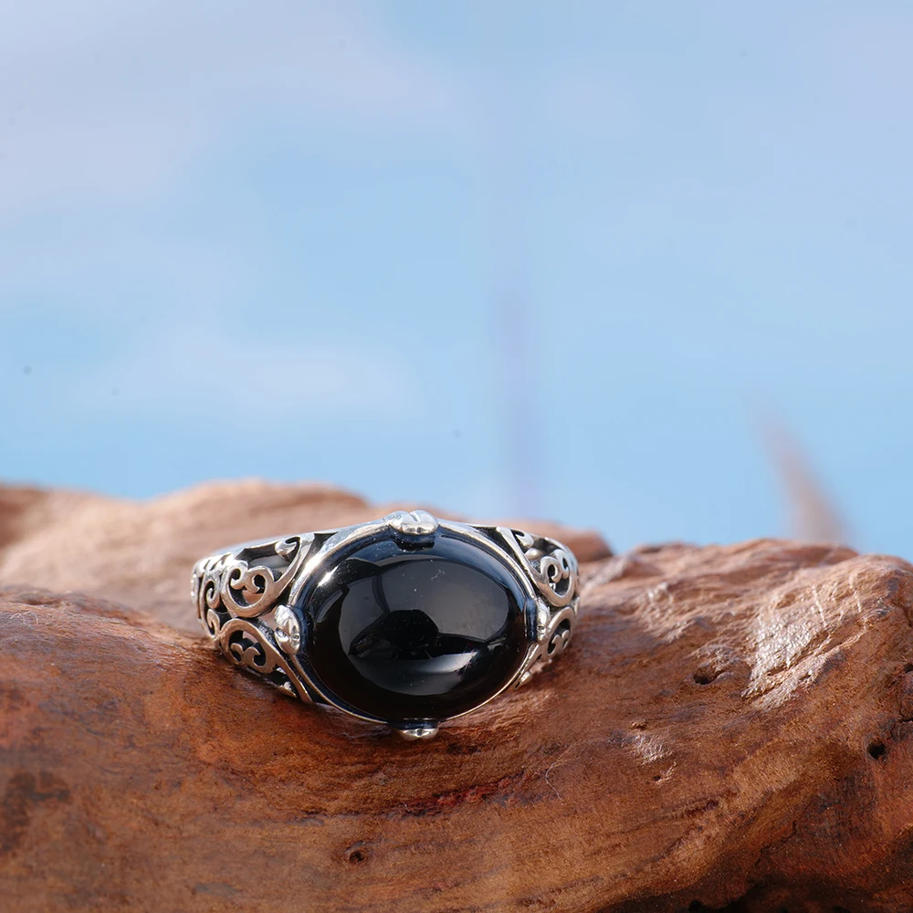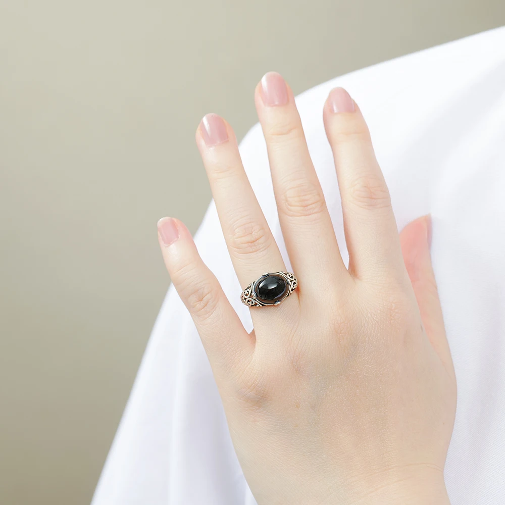 Mystical Elegance: Featuring a 10x12mm oval black onyx gemstone, symbolizing strength and protection, set in a prong setting to maximize its natural allure.