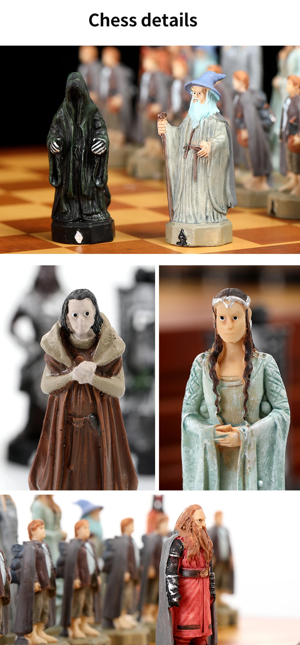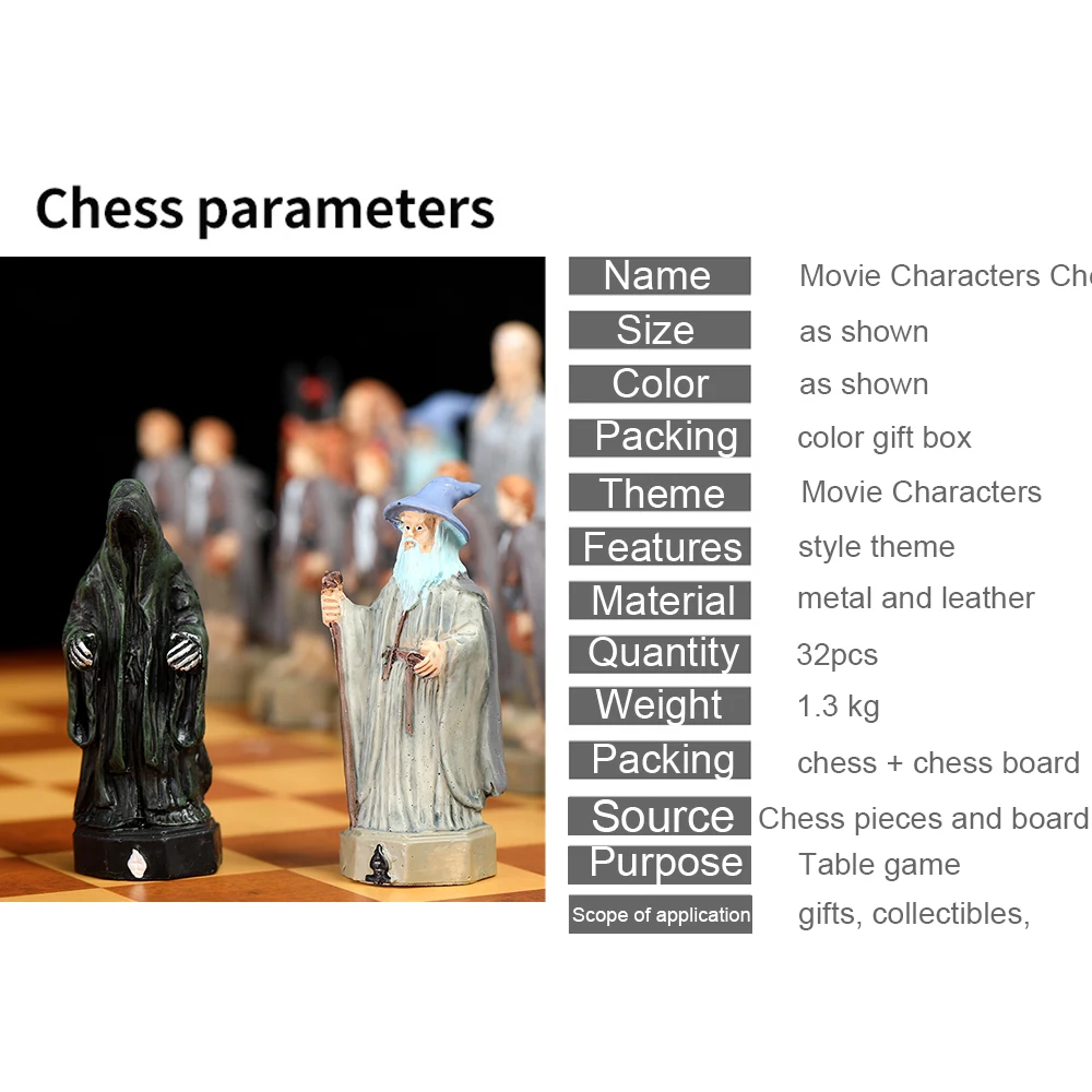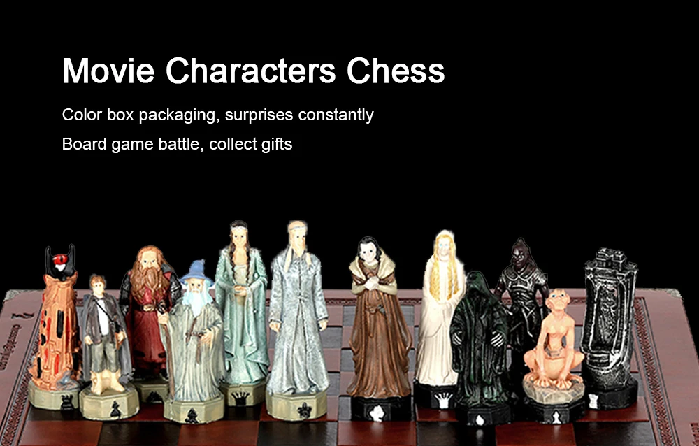 Movie-themed chess set with 32 3D carved and painted chess pieces paired with embossed leather checkerboard