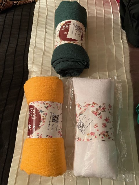 Ordered three colors . Which includes Mustard yellow, white and green. Looks exactly like photo this is my second order . The material is soft. Good quality and the vendor executed fast shipment . Thanks