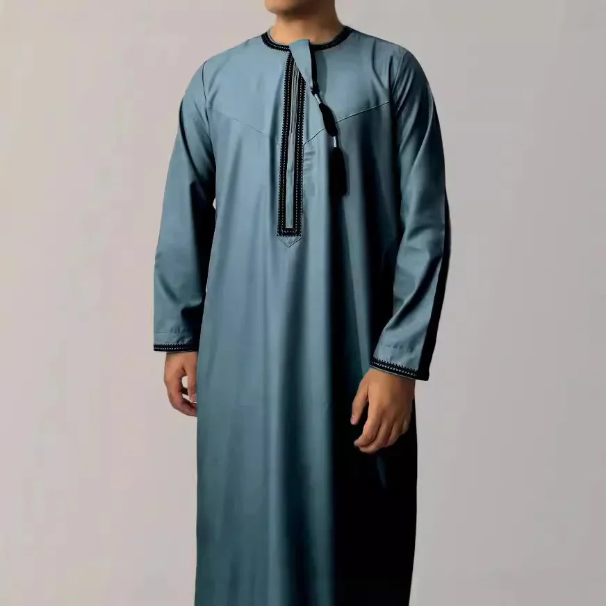 Eid Ramadan Muslim Men Long Robe Round Neck Embroidered Oman Dubai Arabian Saudi Male Jubba Thobe Adults Abayas Islamic Kamis