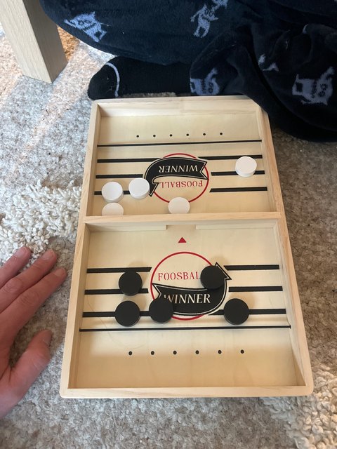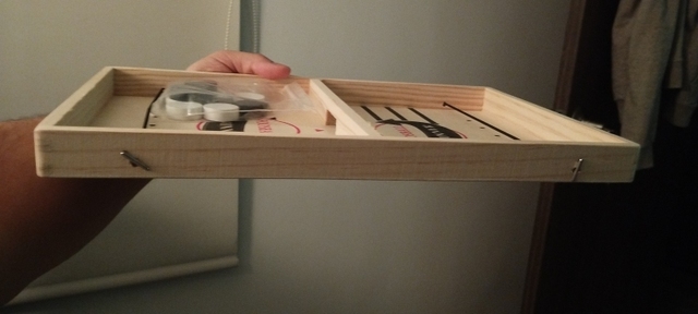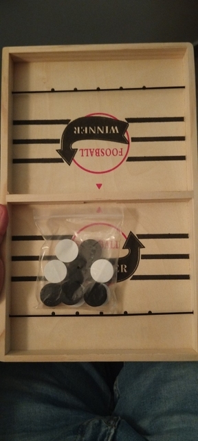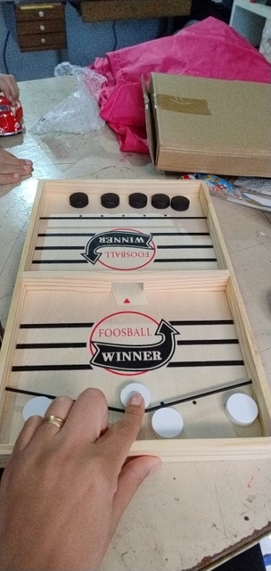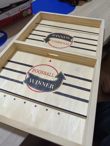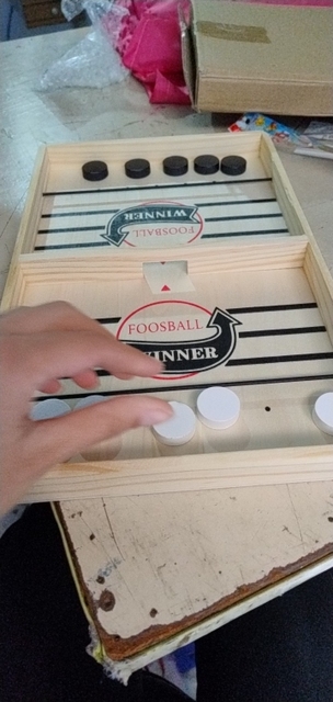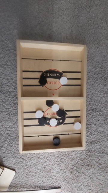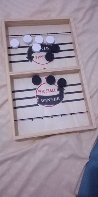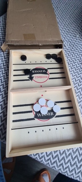 It is a curious game, I think it is more appropriate for each player to have one shot per turn, and try to push your pucks through the gap before the opposite. The wood has come in good condition but one of the tires was peeled and I had to fix it Anyway for that price little more can be ordered. A curious game to add to the collection of home board games