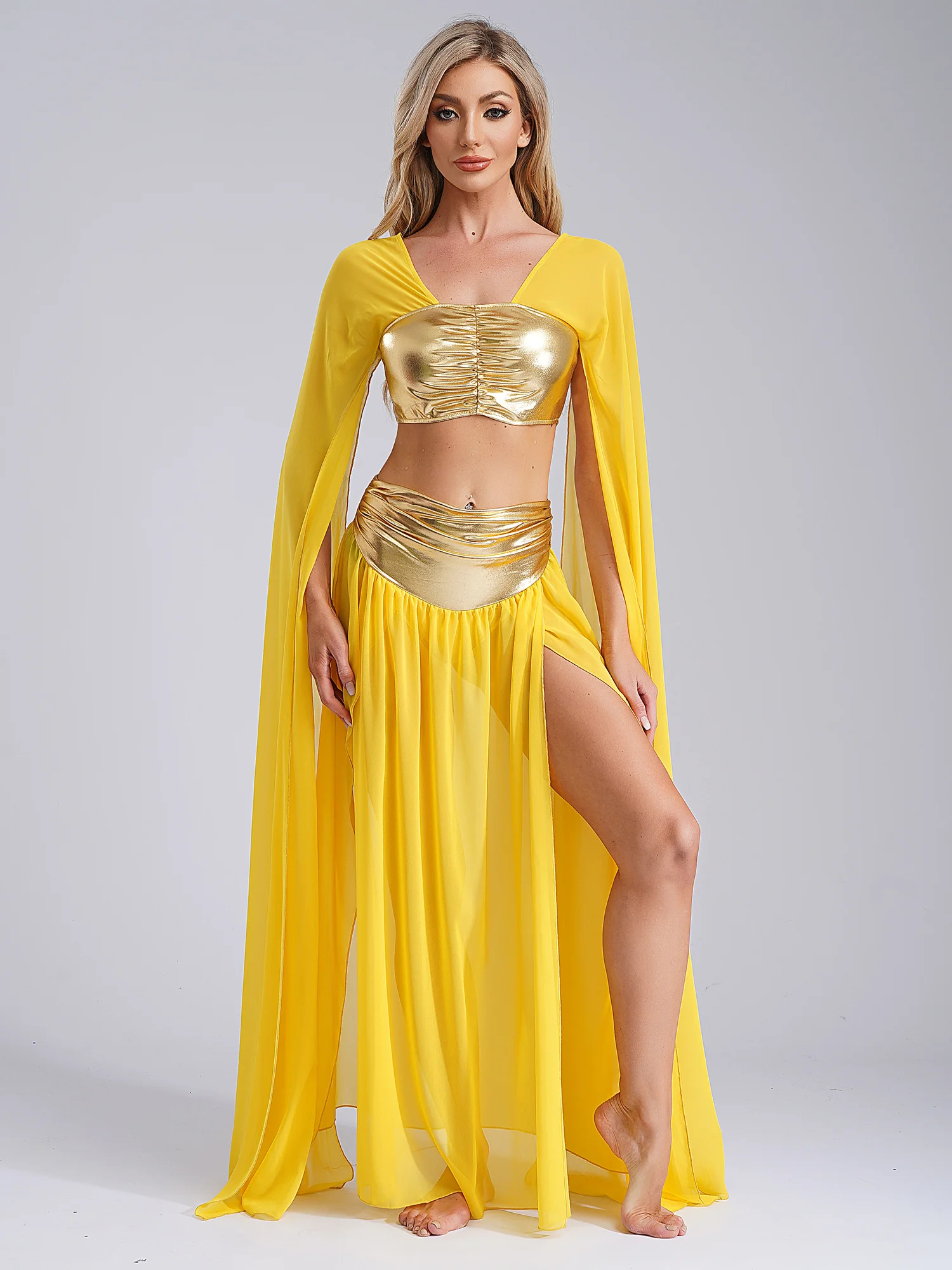 Ancient egyptian Cleopatra cosplay costume for women, includes a crop top and a chiffon dress.