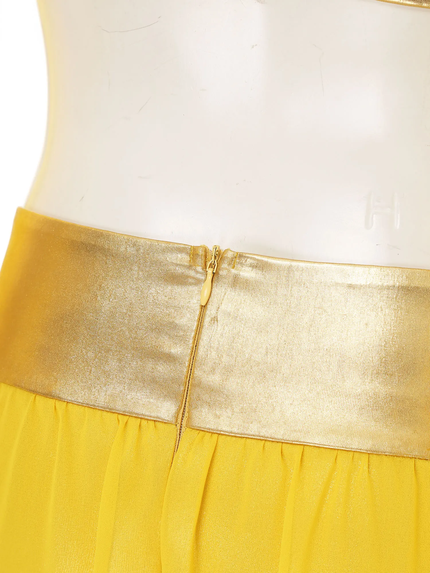 V neck, long sleeve, crop top, high waist chiffon dress with built-in underwear and stylish slit.