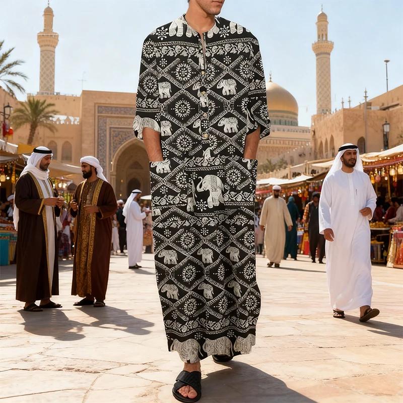 Warning: Trying to access array offset on false in /home/u975142233/domains/kkbazzar.com/public_html/wp-content/plugins/alidswoo/includes/adsw/adsCurrency.php on line 0 Men's Muslim Robes Ethnic Graphics Printed Long Sleeve Cotton Pockets Robes Casual Islamic Arab Kaftan Dubai Kaftan 2025 New | Khan El Khalili Bazzar