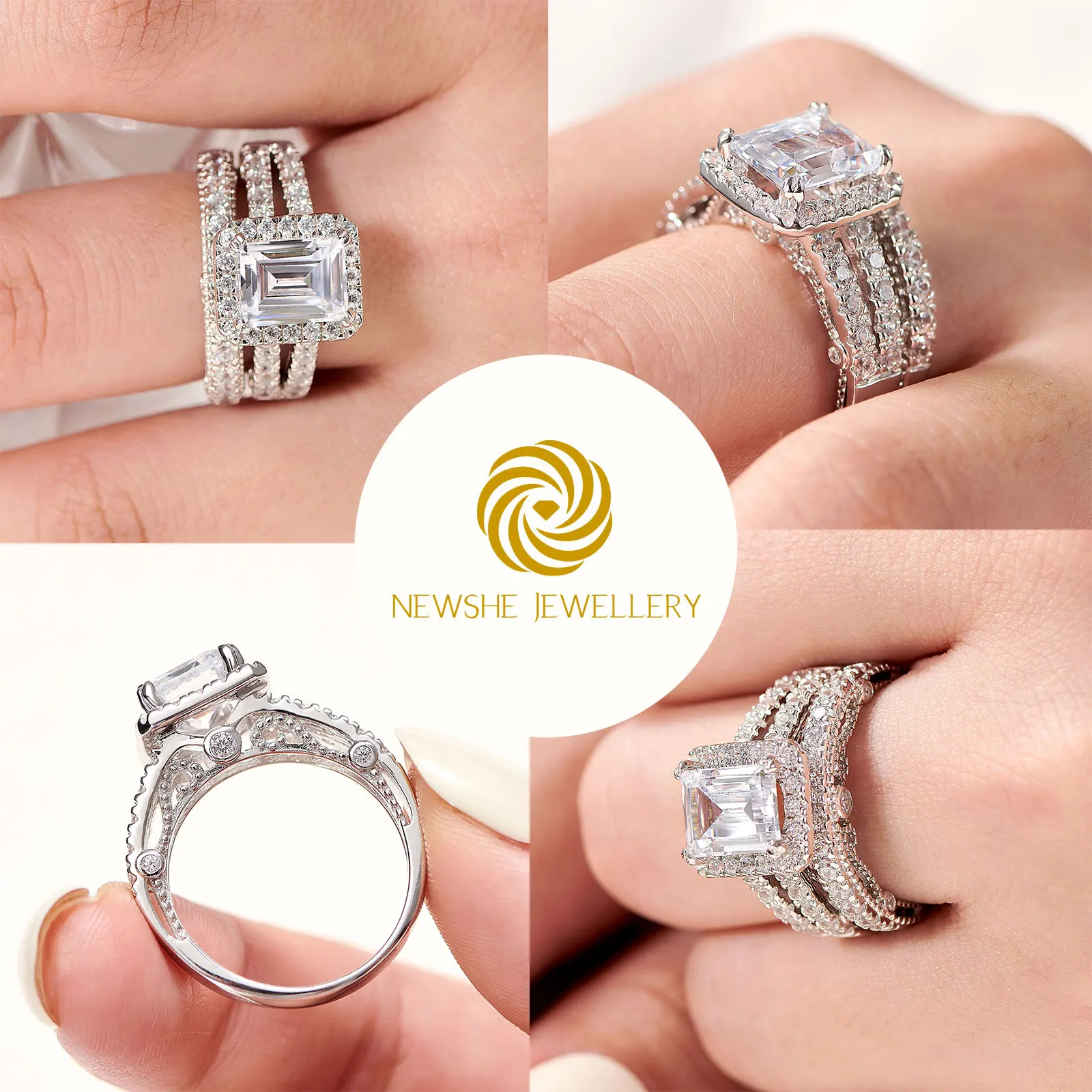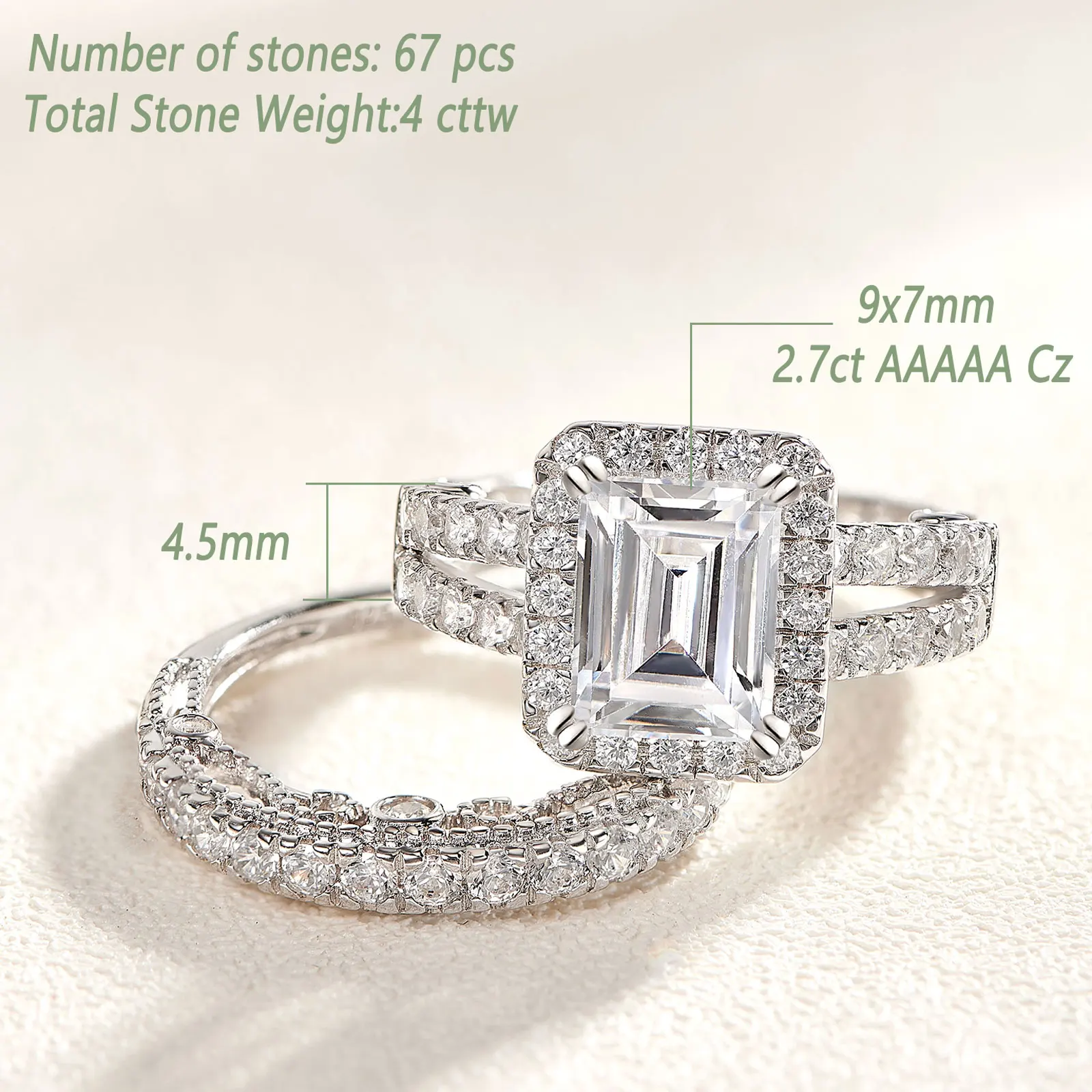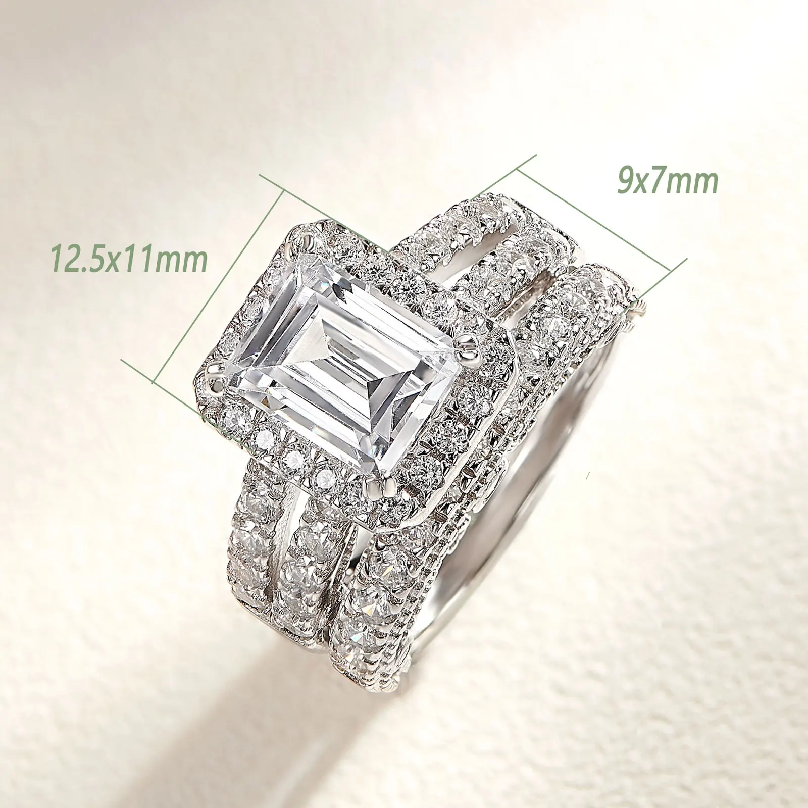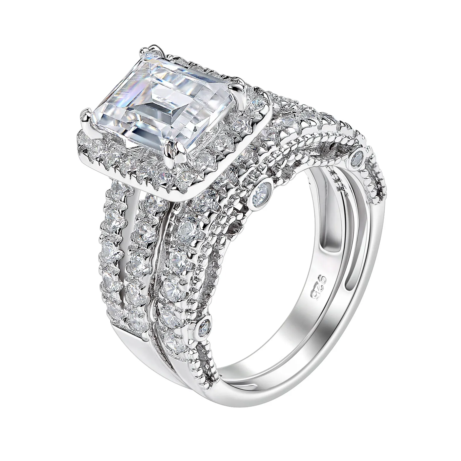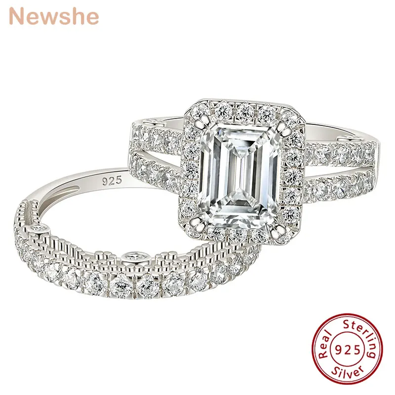 2pcs Newshe Jewellery White AAAAA Cz 925 Sterling Silver Emerald Cut Bridal Engagement Wedding Ring Set for Women