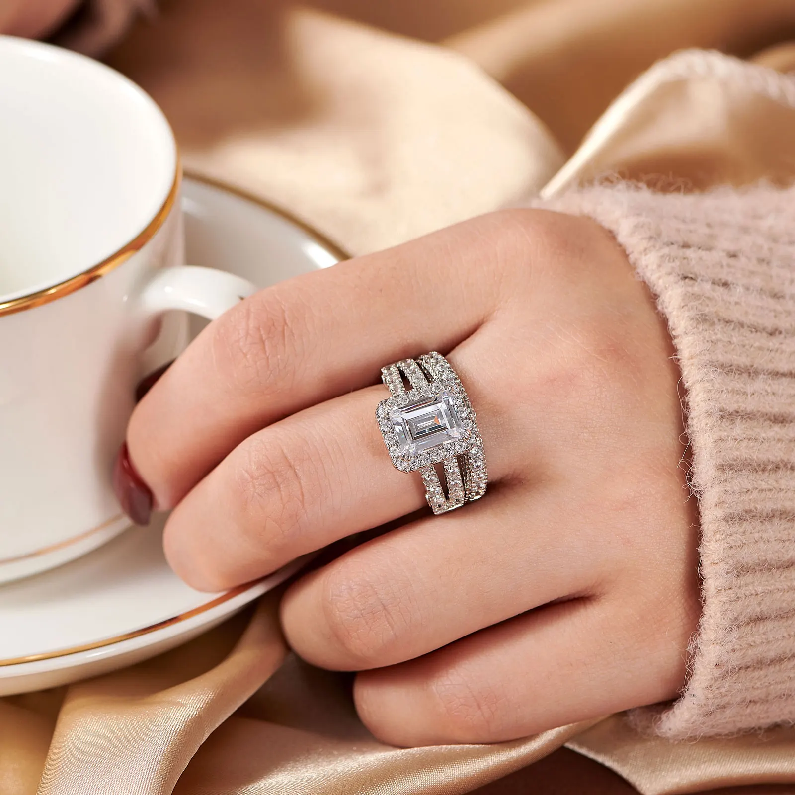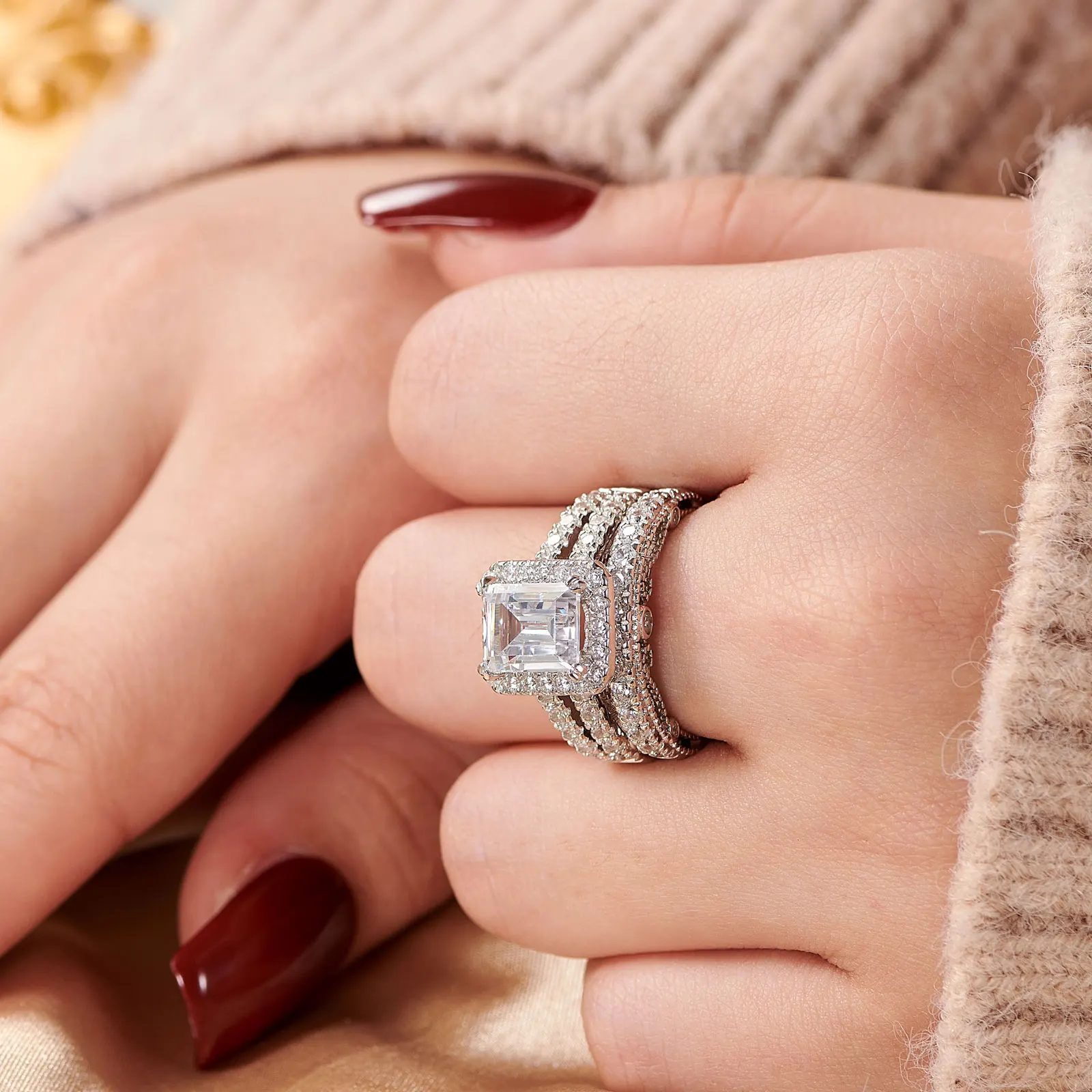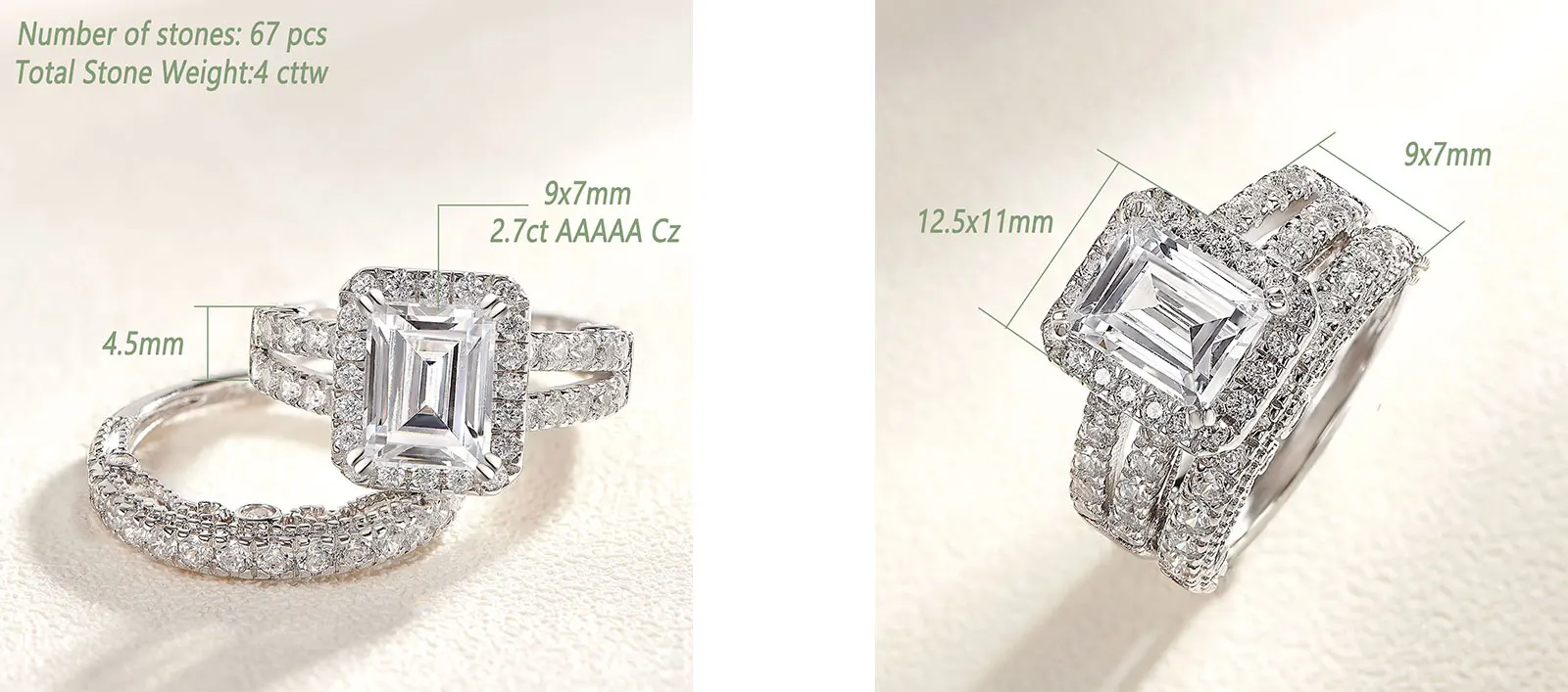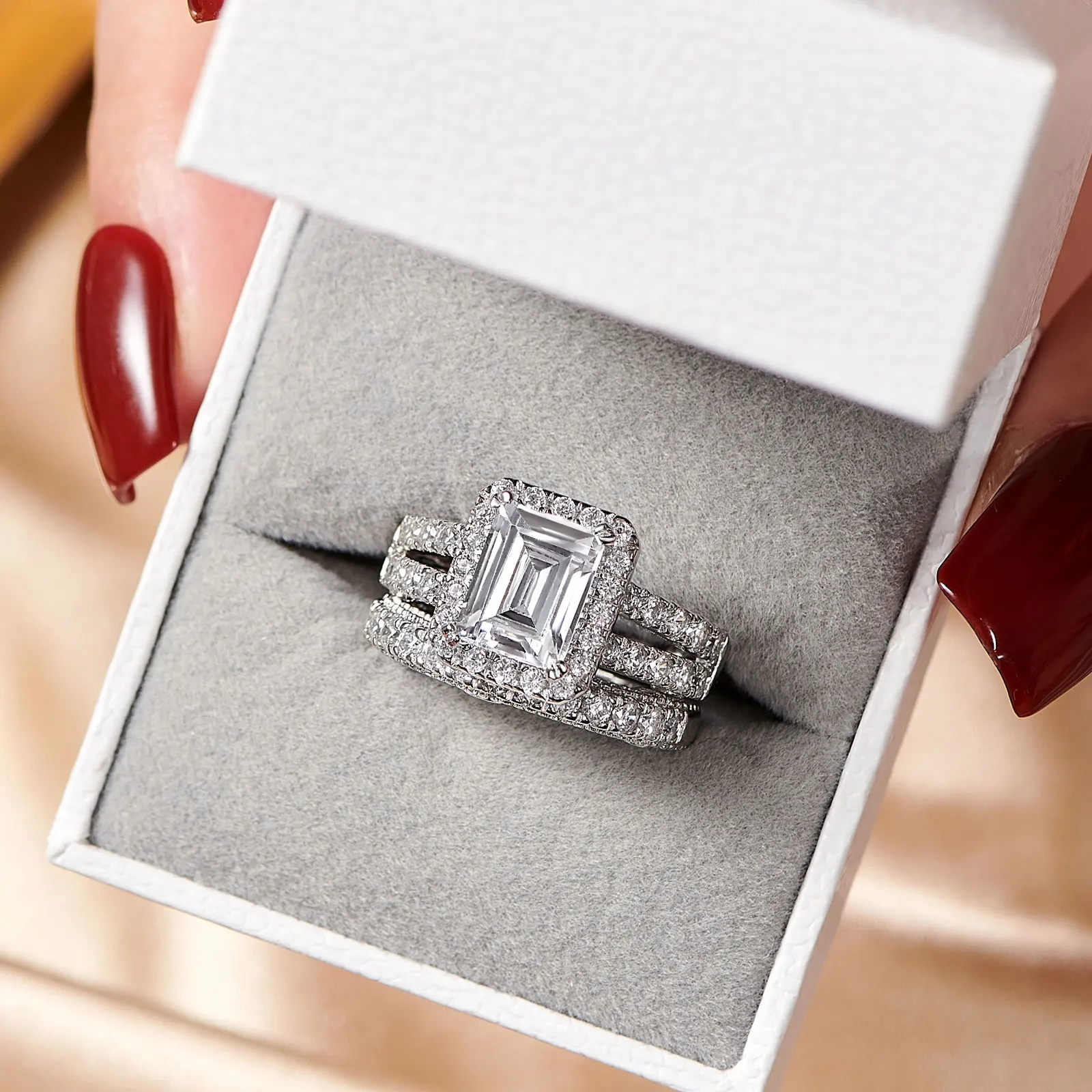 2pcs Newshe Jewellery White AAAAA Cz 925 Sterling Silver Emerald Cut Bridal Engagement Wedding Ring Set for Women