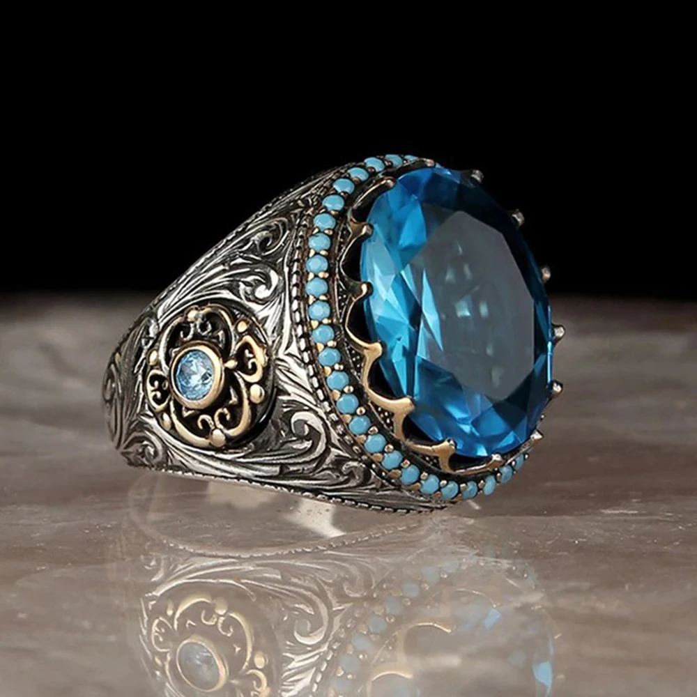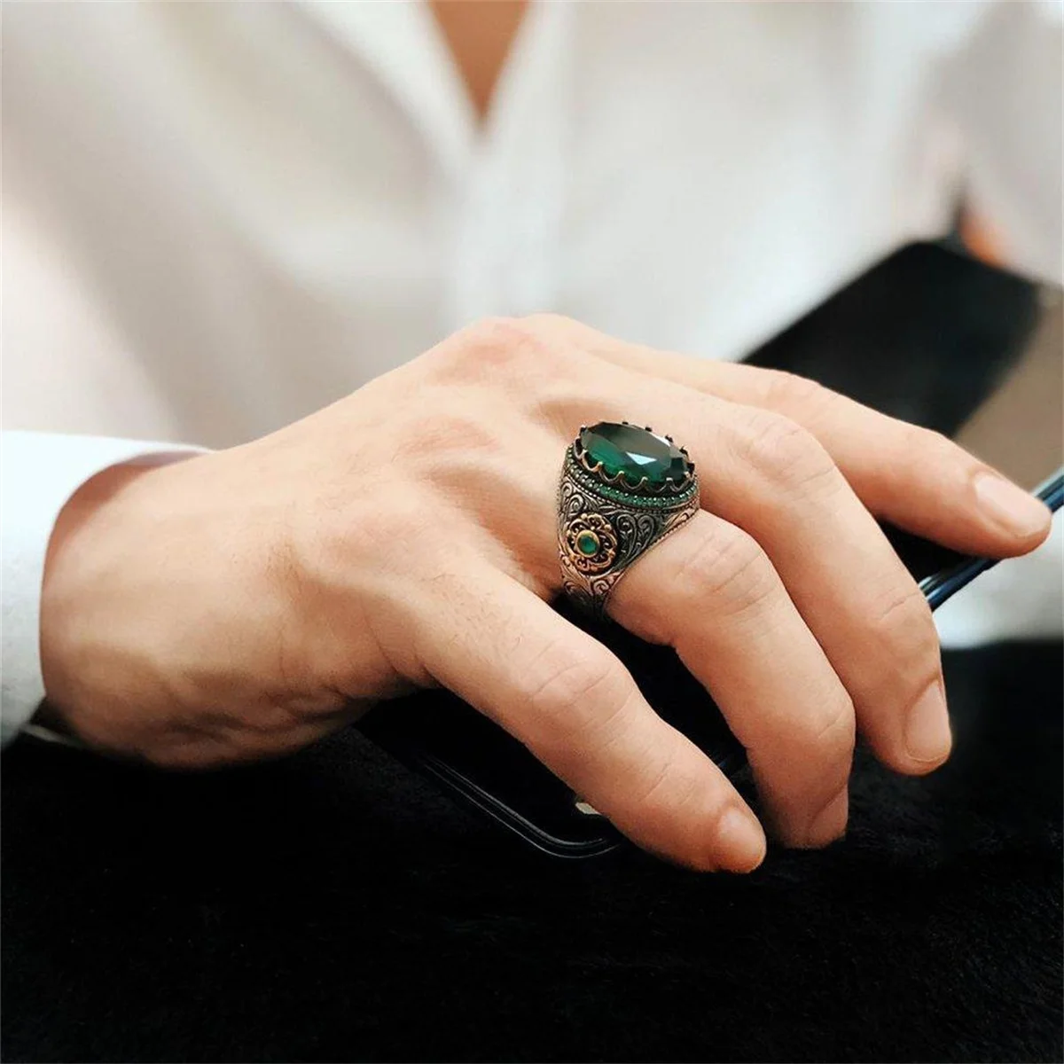 Retro Handmade Turkish Signet Ring For Men Women Ancient Silver Color Carved Eagle Ring Green Zircon Inlay Punk Motor Biker Ring