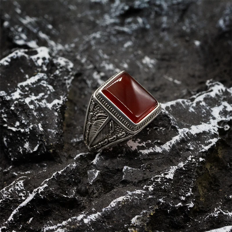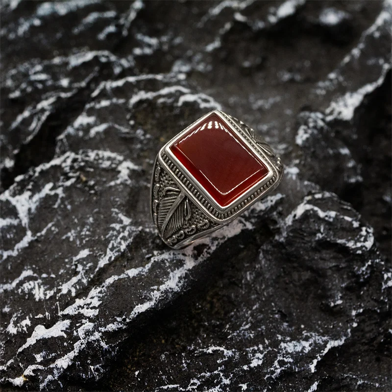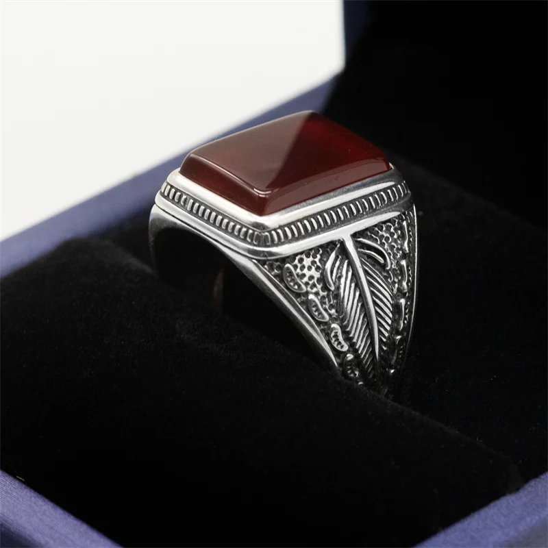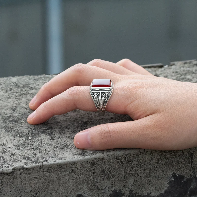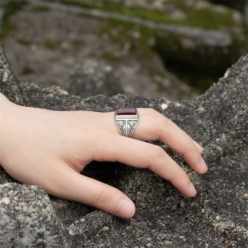 Silver 925 Men Turkish Vintage Sterling Stylish and Unique Red Natural Agate Stone Men Ring