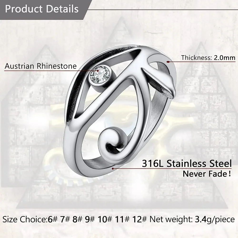 U7 CZ Eye of Horus Ring Stainless Steel/Black/Gold Plated Ancient Egyptian Protection Jewelry Mens Signet Rings, Size 7 to 14
