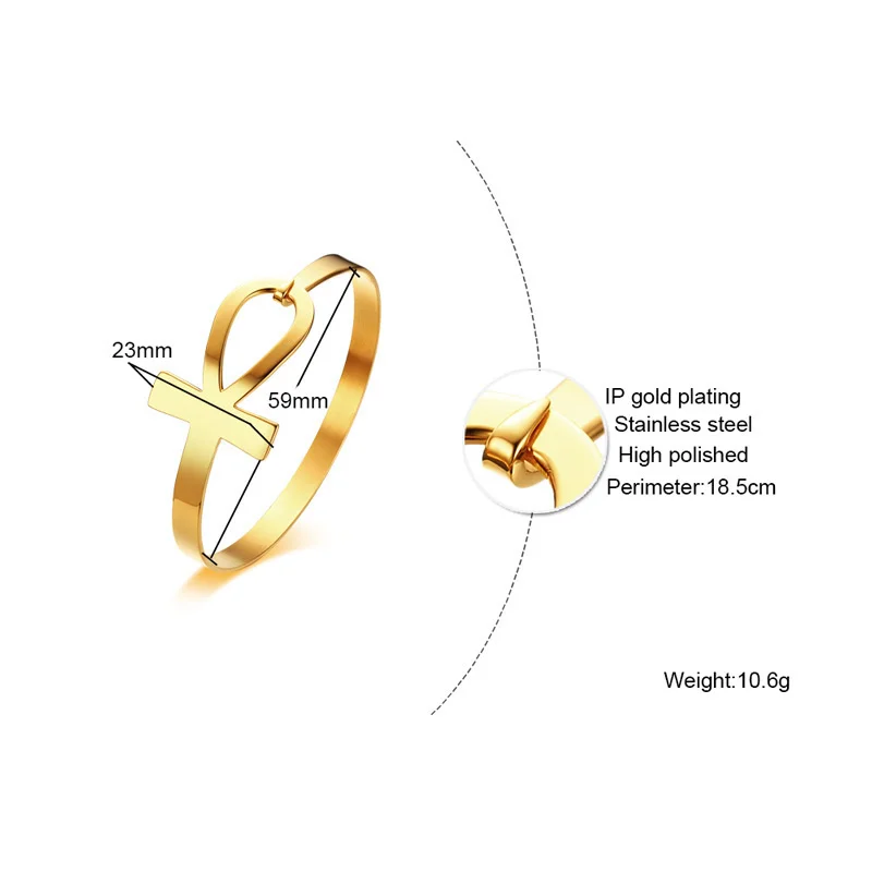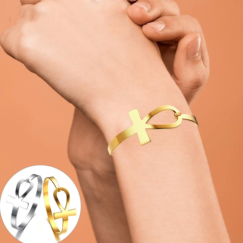 Women’s Cross Bracelets, Anti Allergy Stainless Steel Key of Life Bangle Bracelet, Female Egypt Religious Wristband Jewelry