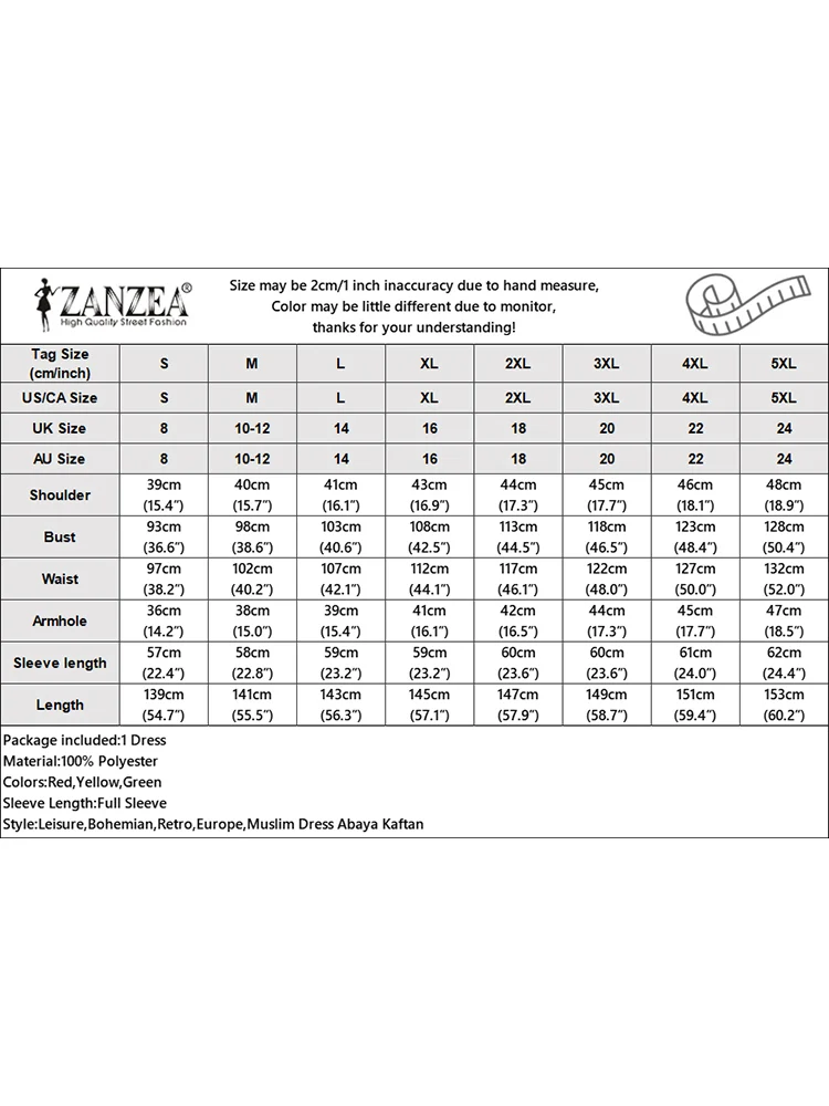 Material:100% Polyester Colors:Red,Yellow,Green Sleeve Length:Full Sleeve Neckline:O-Neck Pattern:Printing Length:Ankle Length Buckle chain:Buttons on the back Thickness:Thin Style:Leisure,Bohemian,Retro,Europe,Muslim Dress Abaya Kaftan Season:Spring,Summer Occasion:Family,Party,Wedding,Holiday,Employment Label: Yes Attentions: 1.The Real Object May Exist Slightly Colors Differences Compared To Images As Different Computers Display.Caution If Minding,Thanks. 2.There Might Be A Manual Measuring 1-3 cm Error.Sorry For Any Inconvenience. 3.Please Prevail On Real Item, Model Images For Reference Only. 4.Attention!!!Please check the size chart carefully before placing the order. |